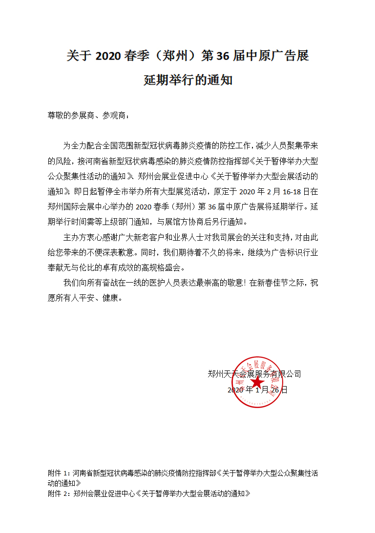 關(guān)于2020春季(鄭州)第36屆中原廣告展延期舉行的通知